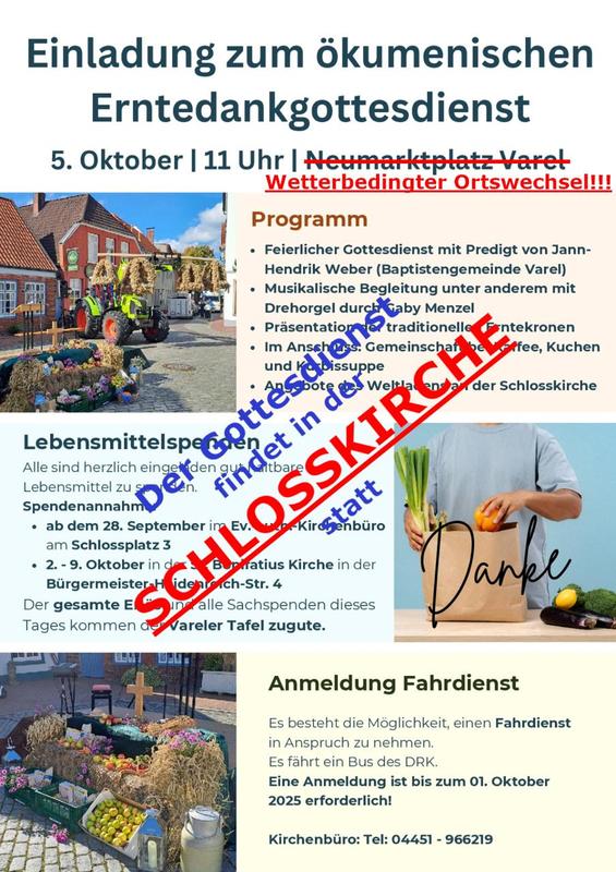 Aufgrung der schlechten Wetterprognose wird der ökumenische Gottesdienst zum Erntedank 2026 um 11:00 Uhr in der Schlosskirche stattfinden.