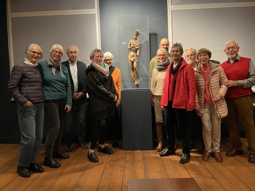 Einen spannenden Einblick in das Werk des Bildhauers und Schnitzers Ludwig Münstermann erhielt eine Vareler Gemeindegruppe am 29. Oktober 2025 während einer Führung im Augusteum. Andrea Kühn führte durch die Ausstellung und verstand es, die Blicke auf die typischen Gestaltungsmotive des Künstlers zu richten. Münstermanns Figuren entsprechen nicht dem klassischen Ideal, sondern zeichnen sich durch übertriebene Körperformen, überlängte Gliedmaßen und übertriebene Posen aus. Beeindruckend ist die faszinierende Ausdruckskraft der einzelnen Skulpturen, z.B. der Teufel mit zahnlosem Mund, hängenden weiblichen Brüsten und Eselsohren. Kunstwissenschaftler ordnen seine Werke dem protestantischen Manierismus zu. Interessant zu erfahren, dass die Bemalungen der Skulpturen aus Lindenholz und Eichenholz nicht durch die Münstermannsche Werkstatt selbst, sondern von dafür zuständigen Fassmalern durchgeführt wurden. Besondere Beachtung fand die knapp ein Meter hohe Eichenholzskulptur des Apolls (s. Foto), die vor vierhundert Jahren von Münstermann für die Schlosskirche St. Petri in Varel angefertigt, jedoch im Zuge eines Orgelneubaus entfernt und von einem Privatsammler gekauft wurde und schließlich auf Umwegen im Bode-Museum in Berlin landete. Die Ausstellung macht Lust, Münstermanns weitere kirchliche Kunstwerke an ihren Originalschauplätzen im Oldenburger Land zu besuchen.