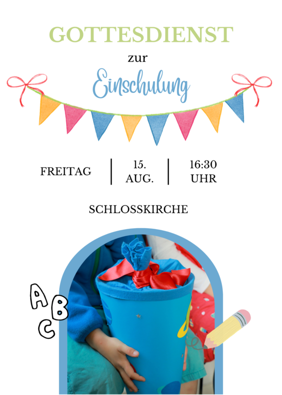 Der Gottesdienst zur Einschulung für die Grundschule am Schlossplatz, die Grundschule Osterstraße und die Hafenschule findet am Freitag, den 15. August 2025 um 16:30 Uhr in der Schlosskirche statt. Eltern, Geschwister, Großeltern, Patinnen und Freunde - alle sind herzlich willkommen mitzufeiern, mitzusingen und für die Schulanfänger:innen zu beten.